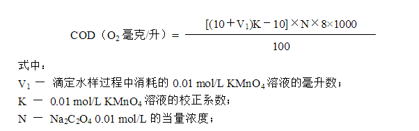 4.6 KMnO4溶液校正系數的測定:取步驟4.5滴定完畢的水樣,用滴定管加入10ml(0.01 mol/L)Na2C2O4溶液,再用0.01 mol/L KMnO4溶液回滴**溶液呈微紅色。記錄相當于10ml(0.01 mol/L)Na2C2O4溶液的KMnO4溶液的毫升數V2,則KMnO4溶液的校正系數K=10/ V2。