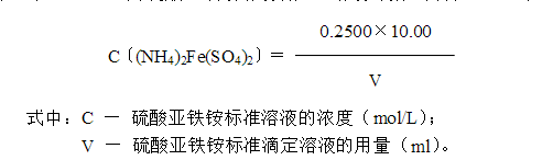 8.7 每次實驗時,應對硫酸亞鐵銨標準滴定溶液進行標定,室溫較高時尤其應注意其濃度的變化。標定方法亦可采用如下操作:于空白試驗滴定結束后的溶液中,準確加入10.00ml、0.2500mol/L重鉻酸鉀溶液,混勻,然后用硫酸亞鐵銨溶液進行標定。
