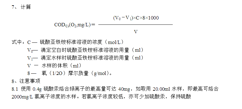 8.3 對于化學需氧量小于50mg/L的水樣,應改用0.0250mol/L重鉻酸鉀標準溶液。回滴時用0.01mol/L硫酸亞鐵銨標準溶液。