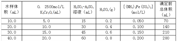 4.測定水樣的同時,取20.00mL蒸餾水,按同樣操作空白實驗。記錄滴定空白時硫酸亞鐵銨標準溶液的用量。
