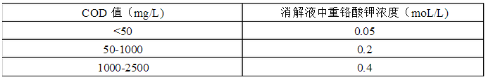 本方法可以測定地表水、生活污水、工業(yè)廢水(包括高鹽廢水)的化學(xué)需氧量,水樣因其化學(xué)需氧量的值有高有低,因此在消解時應(yīng)該選擇不同濃度的重鉻酸鉀消解液進行消解。參考下表選擇消解液。