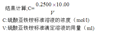 硫酸亞鐵銨溶液的標(biāo)定:準(zhǔn)確吸取10.00ml重鉻酸鉀標(biāo)準(zhǔn)溶液于500ml的錐形瓶中,加水稀釋**110ml左右,緩慢加入30ml濃硫酸,混勻。冷卻后,加入3滴試亞鐵靈指示劑,用硫酸亞鐵銨溶液滴定,溶液的顏色由黃色經(jīng)藍綠色**紅褐色即為滴定終點。
